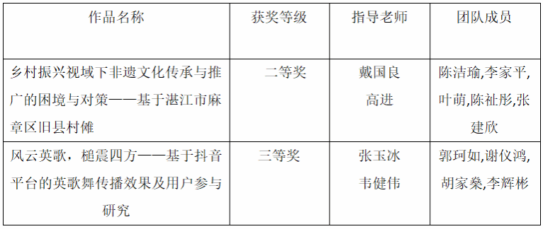 省级二等奖团队-比完带导师吃烧鸡队:该团队为pp电子游戏官网和文学与传媒学院跨院系组队,由戴国良、高进老师指导,陈洁瑜、李家平、叶萌、陈祉彤及张建欣同学组成。团队秉持着让非遗焕发新生的理念,团队多次前往湛江实地调研,运用多样化的分析方法,探索非遗傩舞在新时代发展的路径,为乡村非遗带动乡村振兴提供实践支持和理论支撑。