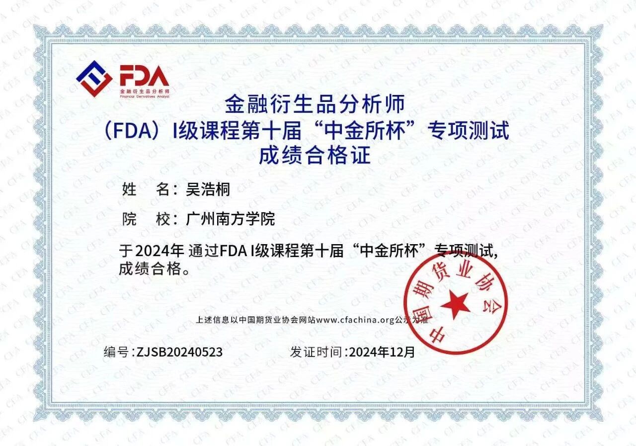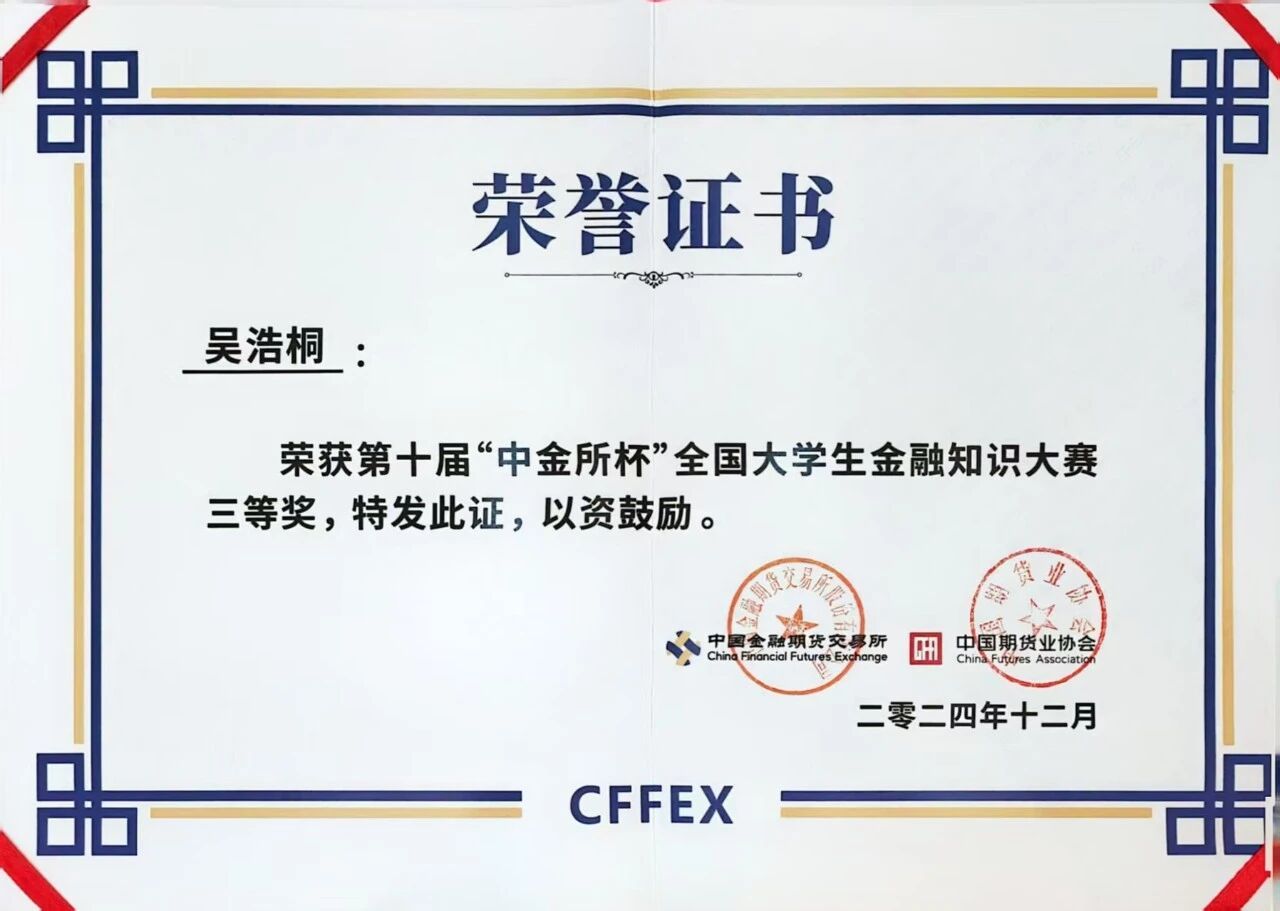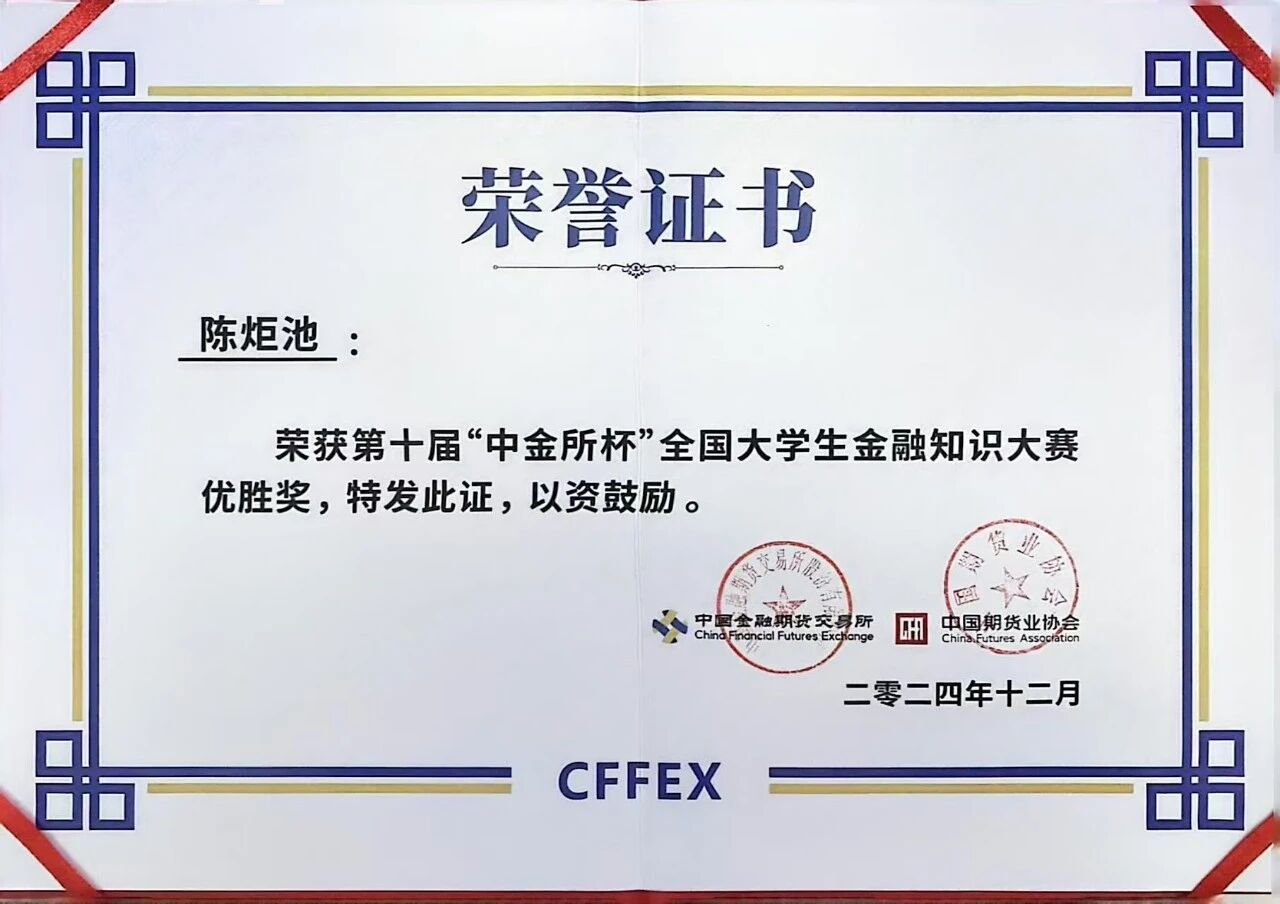 在汇聚了全国顶尖高校本硕博金融英才、竞争异常激烈的第十届“中金所杯”大赛中,pp电子官网吴浩桐、陈炬池同学发挥出色,凭借扎实的金融知识和卓越的现场表现,经过多轮激烈角逐,最终脱颖而出,分别荣获大赛“三等奖”和“优胜奖”。