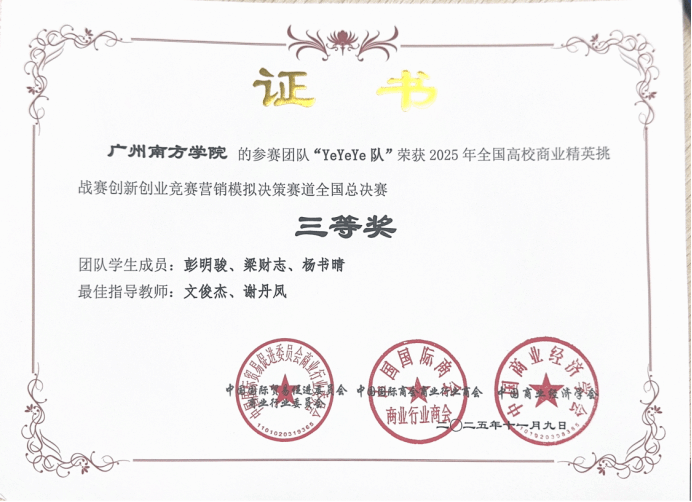 pp电子官网参赛团队由彭明骏、梁财志、杨书晴凭借扎实的专业功底、默契的协作配合,在文俊杰老师和谢丹凤老师的指导下,从众多优秀队伍中脱颖而出,成功斩获全国总决赛三等奖的优异成绩!这份荣誉不仅是对团队成员日夜钻研、反复打磨方案的肯定,更是学校教学成果的生动体现。