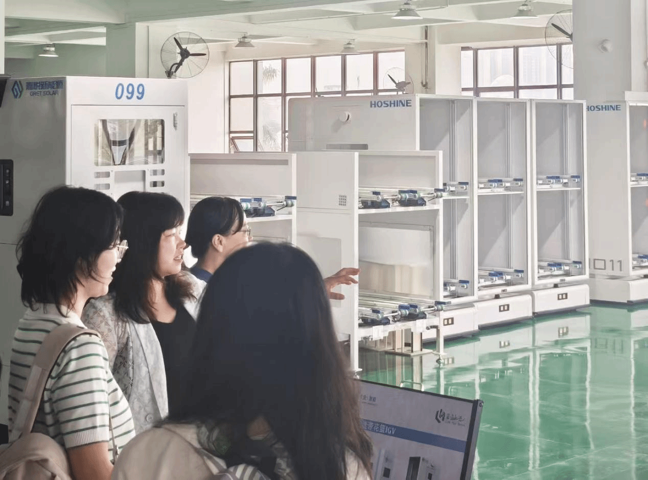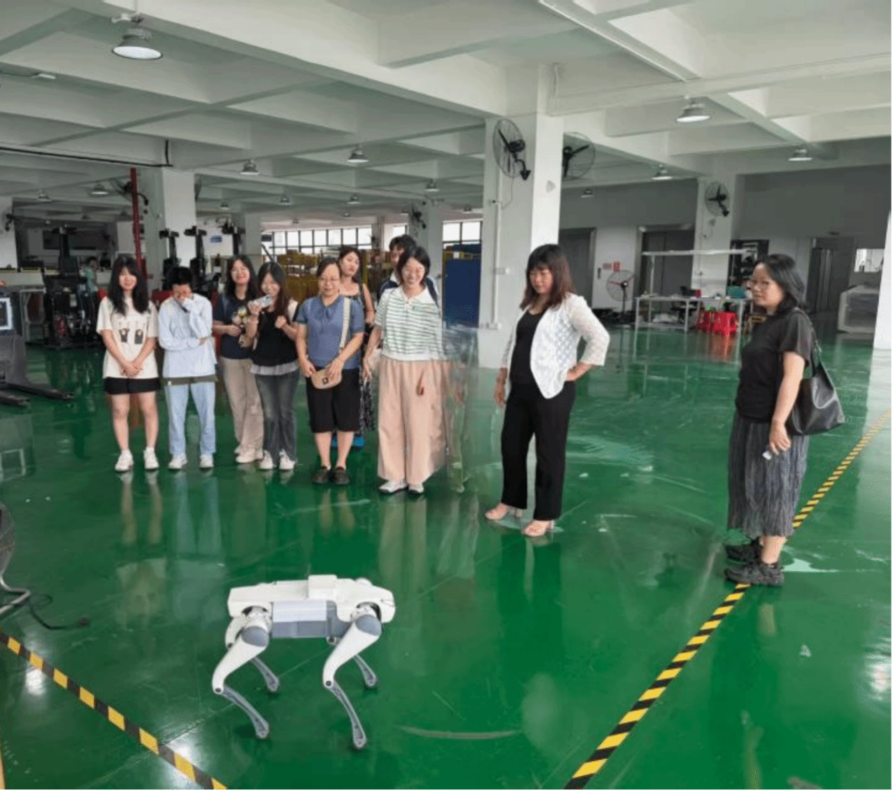 交流会后,蔡容华副总经理带领师生参观了设备调控展示车间,师生得以近距离观摩蓝海机器人的代表性产品。王建兵总经理现场演示了智能机器狗的运作及其工作能力。蔡容华同时介绍了蓝海机器人在数据采集与分析、AI算法应用、智慧工厂项目管理、售前技术支持等岗位的人才需求,并欢迎具备“经济思维+技术理解”能力的复合型人才加入。