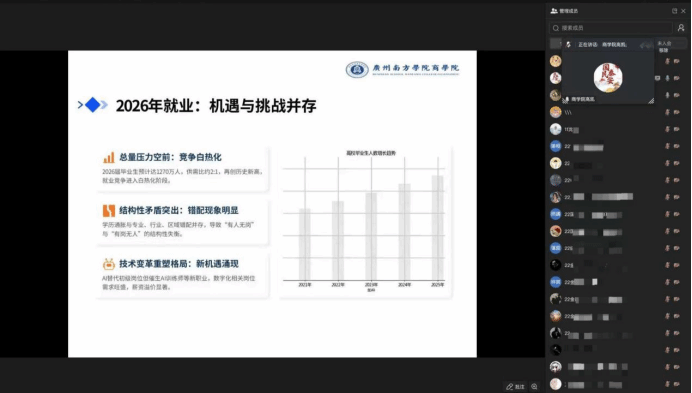 高凯书记首先聚焦2026年全国及粤港澳大湾区就业市场格局,深入剖析当前就业市场“机遇与挑战并存”的整体态势。同时,提出AI技术变革催生新职业,数字经济相关岗位需求旺盛,粤港澳大湾区释放多重政策红利,低空经济、新能源等五大领域人才紧缺,深中一体化、广佛同城化带来多元就业选择,为商科毕业生打造了就业“黄金内湾”。