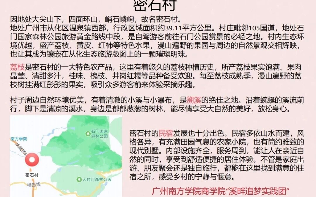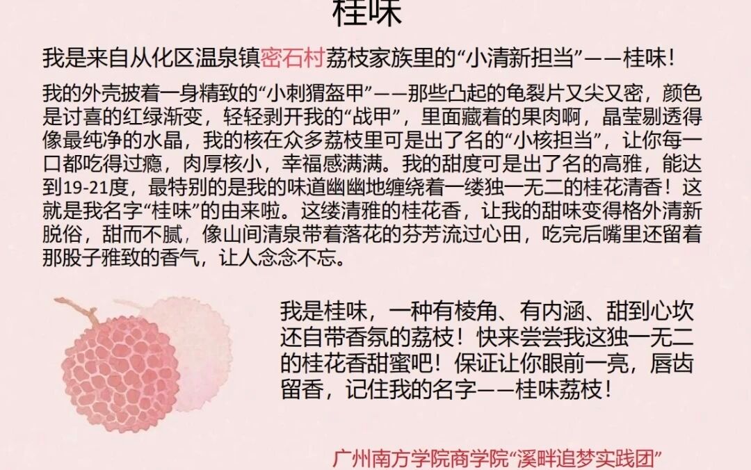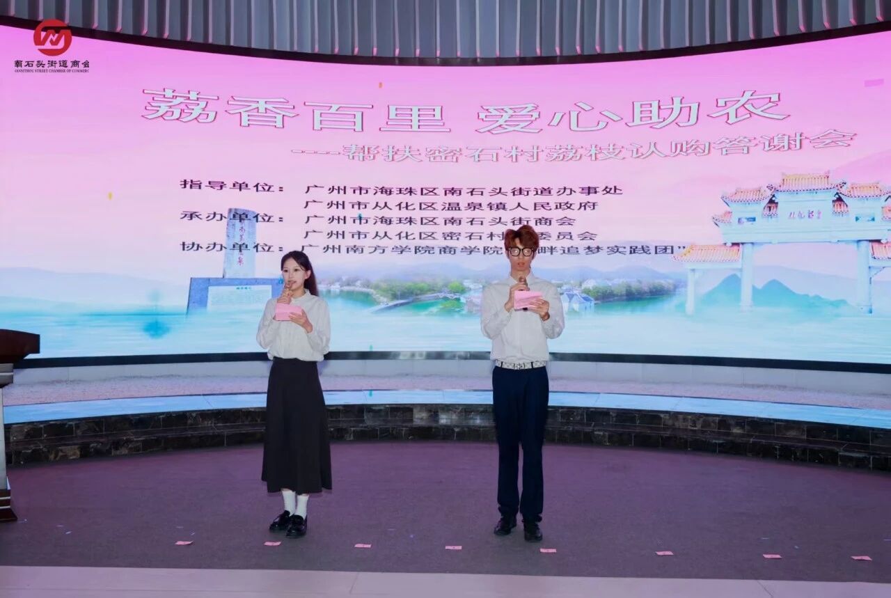 荔香百里,爱心助农。为进一步深化对口帮扶实效,2025 年 7 月 3 日,海珠区南石头街、南石头街商会组织商会会员企业前往从化区温泉镇密石村开展消费帮扶活动。pp电子游戏官网pp电子游戏官网 “溪畔追梦实践团” 师生全力投入支持,通过多次下乡实地走访、反复优化活动策划方案,不仅协助密石村村民设计制作了荔枝科普卡片与荔枝认购卡,更成功策划举办了认购答谢会,以实际行动助力乡村产业发展。