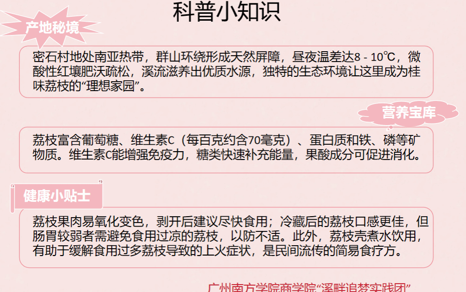 其中,科普卡片以密石村山水插画为视觉主体,融入 “日啖荔枝三百颗” 的诗词元素,分板块介绍密石村自然景观、特色民宿资源,以及桂味、槐枝、井岗红糯等核心品种的形态、口感与种植优势,让收到荔枝的用户通过卡片直观了解温泉镇的生态魅力、密石村的旅游价值及荔枝品种特色。而荔枝认购卡则嵌入专属二维码,认购用户扫码即可获取密石村荔枝种植溯源信息、采摘体验预约渠道及售后回购链接,通过数字化手段促进二次消费。