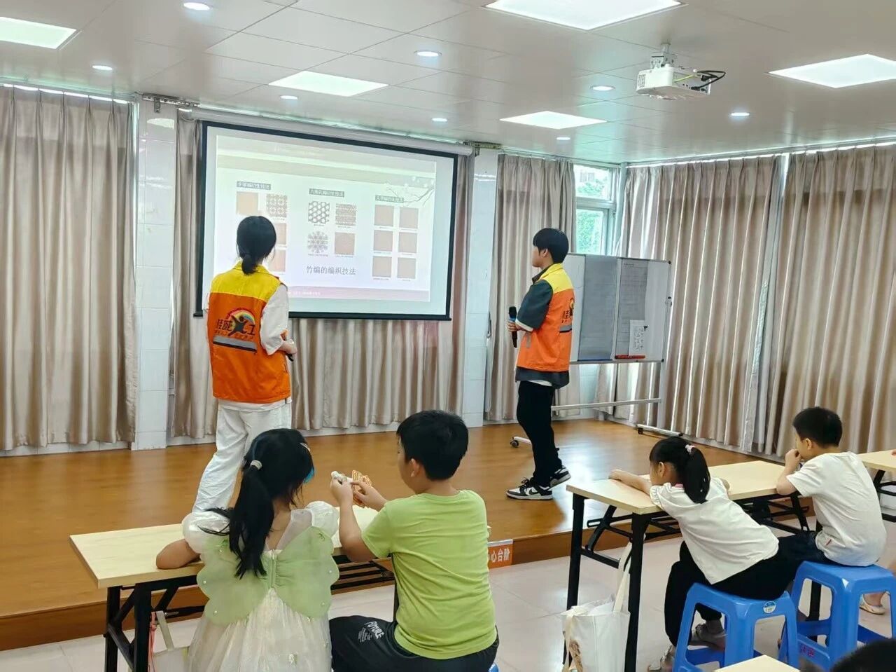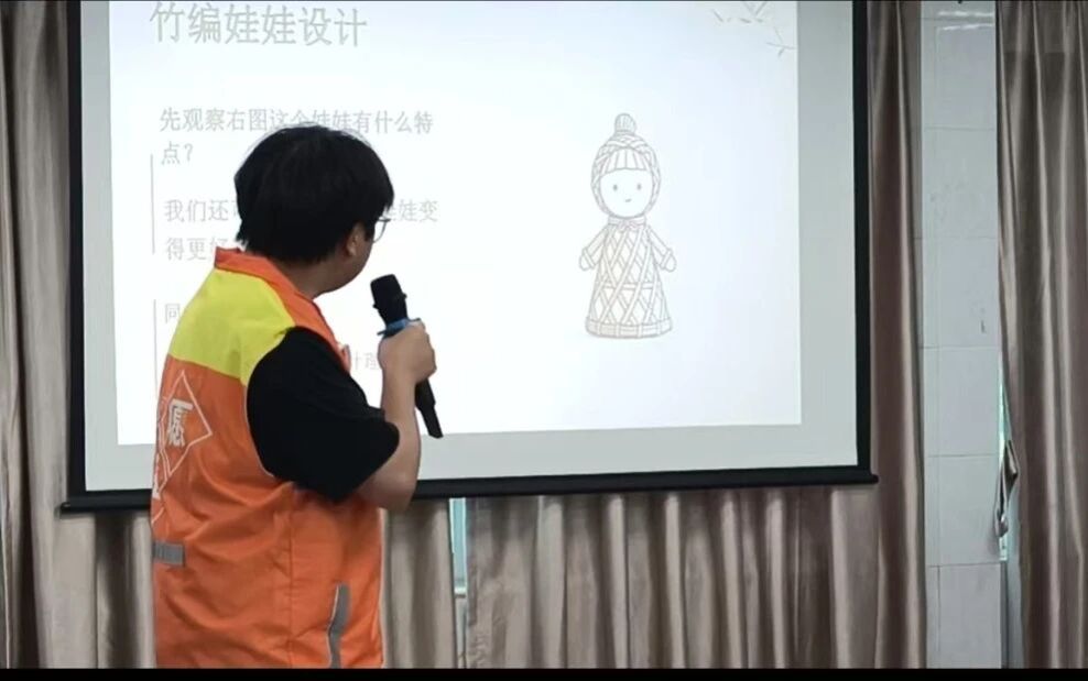 下午的竹编理论课,成了传统技艺的小课堂。小卓老师和紫泥老师站在投影前,把竹编技法拆解成清晰步骤,从基础编织到花样变化,一一讲解。孩子们围坐桌边,眼睛追着屏幕上的竹篾图案,专注又好奇,在经纬交错的知识里,触摸非遗传承的温度,期待他们后续亲手编织的惊喜。