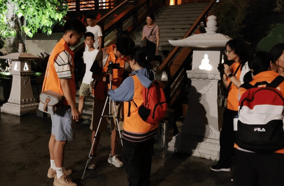华灯初上,我们扛起设备前往揭阳规模最大的古寺院——双峰寺。飞檐在暖黄灯光下勾勒出清晰的轮廓,寺前的一池荷花含苞待放,雨铃随着微风叮当作响,仿佛听见阵阵梵音在耳畔萦绕。我们屏息凝神,用镜头虔诚地记录下这一瞬间,生怕惊扰了这份历史的静谧。它如同沉默的守护者,见证了时代更替,向每个过路的人讲述独属揭阳的故事。