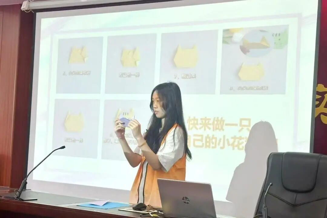 第二节课是手工课,小老师吴泽思(芝士老师)带领孩子们进入了一个充满创意的手工世界。课堂上,小老师首先介绍了基础折纸的步骤,通过详细的图解和示范,孩子们一步步学会了如何折出一只可爱的小猫。随后,孩子们进入创意装饰时间,用彩笔为自己的小猫画上喜欢的图案,有的孩子画上了蝴蝶结,有的画上了小鱼,每一只小猫都独一无二。