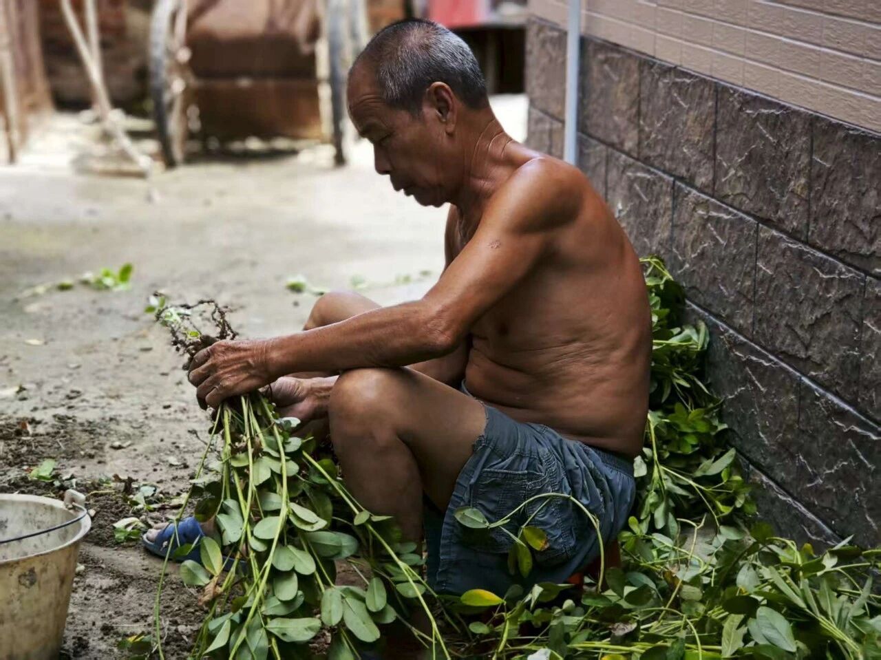 村道拐角处,一地新收的花生散发着泥土的清香。一位老爷爷靠墙而坐,满是老茧的手熟练地摘下饱满的荚果。他告诉我们,自己生于1953年,子女在广州生活,他独自打理田地。今年花生丰收,他每天五点起床忙活,摘下的花生榨油,叶柄埋回地里当肥料。泥土的馈赠,被他细细珍藏。