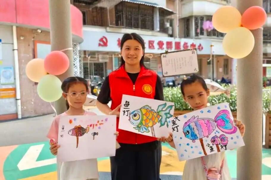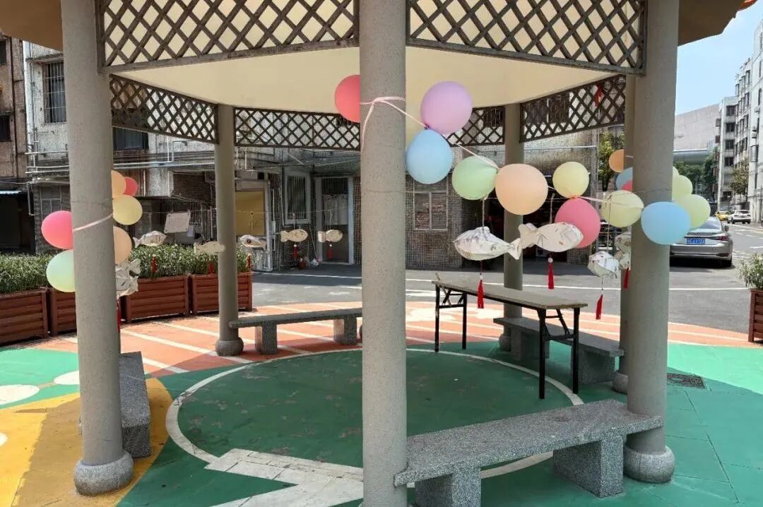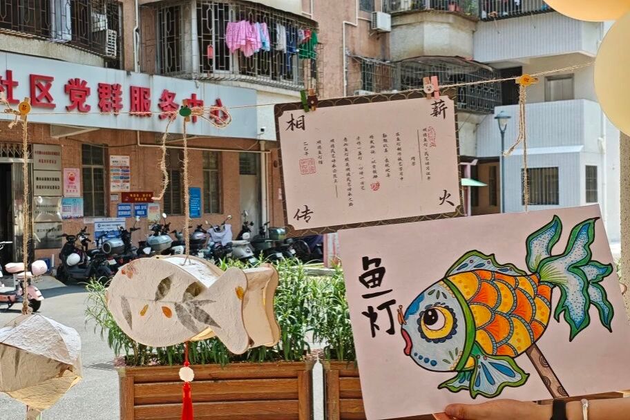 活动的华彩远未止步于课堂。课后,突击队与孩子们一同将凝聚心血的鱼灯作品,连同精心准备的传统装饰,悬挂于社区纳凉亭廊中。精美的鱼灯吸引居民们纷纷驻足,父母们向孩子讲述灯中的吉祥寓意,突击队员则在一旁分享制作趣事与非遗知识。