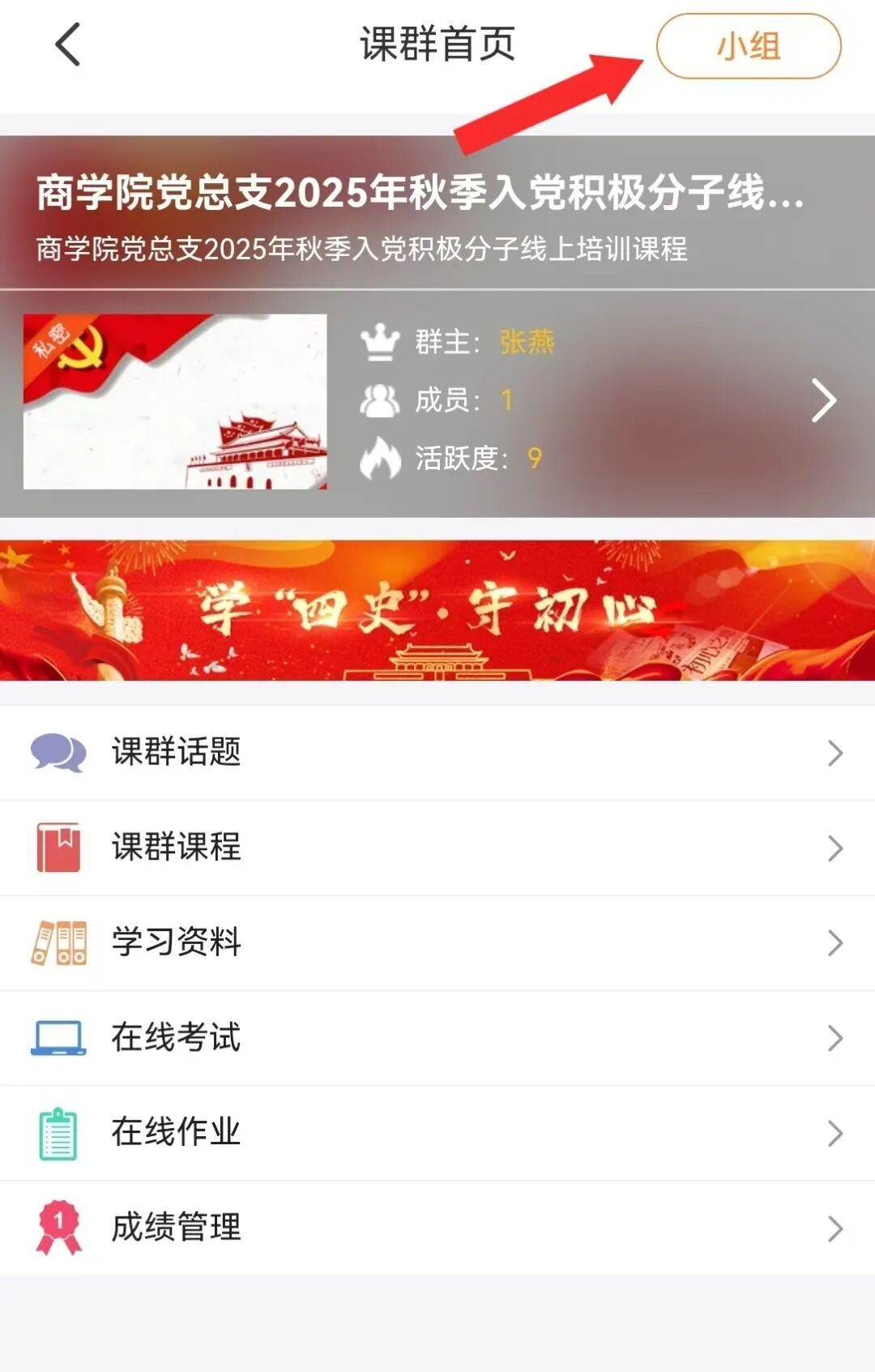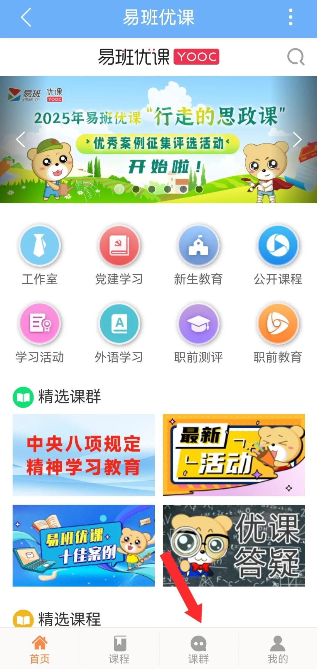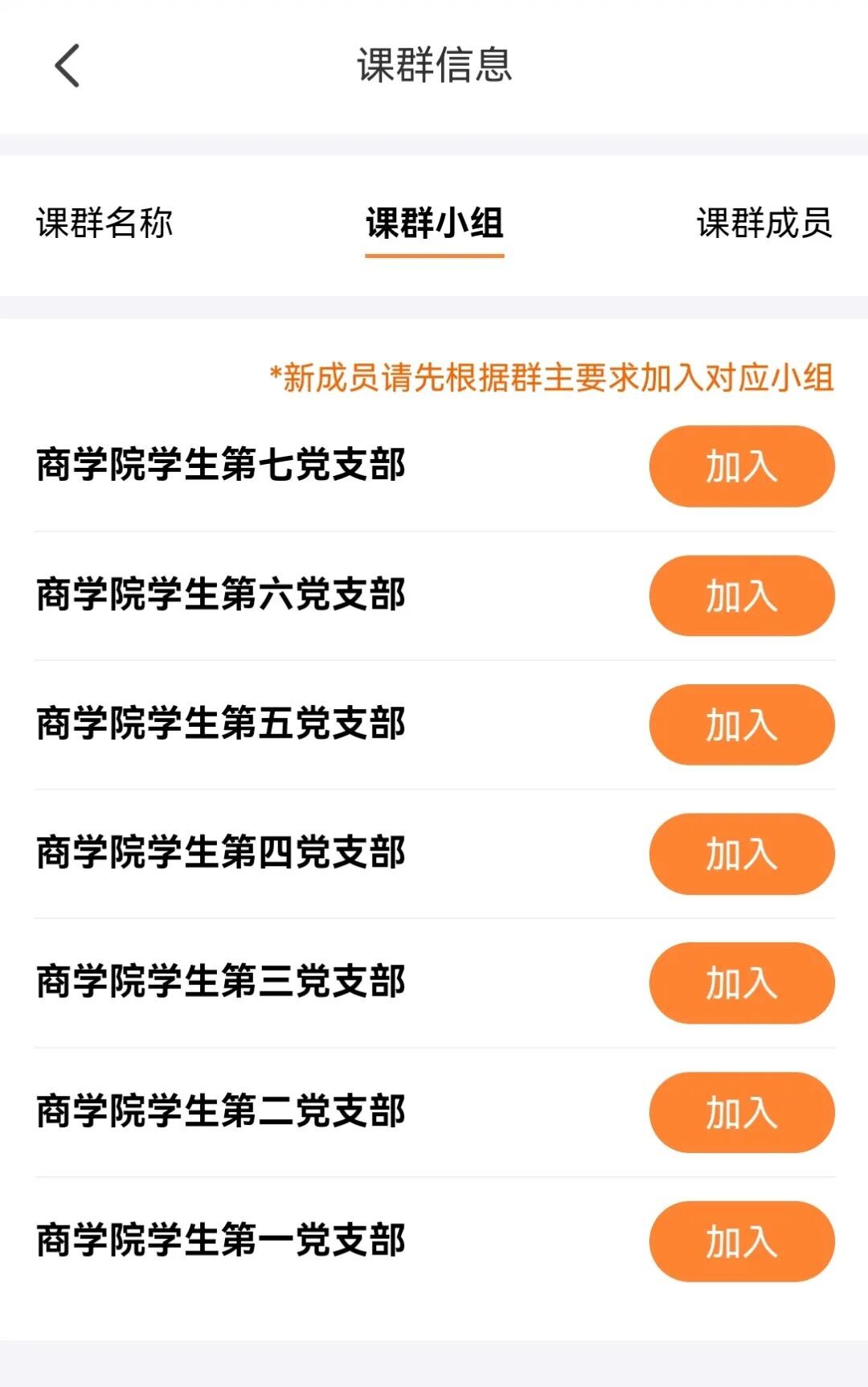 下载易班app并注册→易班app或微信扫码进入→在课群首页点击加入→登录后再次点击加入在课群小组页面中选择自己对应的党支部→完成后在课群首页就能看到