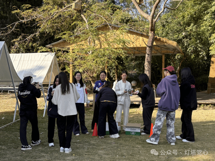 理论学习之余,趣味互动游戏也同步开展,让学习氛围愈发浓厚。“前线志愿”活动现场,成员们分为若干小组,明确“前线人员”与“后勤保障”分工,在裁判的指令下快速搜寻指定物品并送达指定位置。从“知识三篇”到各类指定道具,大家反应迅速、配合默契,在紧张有序的比拼中强化了对全会相关知识的记忆,也锤炼了团队协作能力。“盲人运水”环节中,两两一组的成员们一人蒙眼运水、一人精准指挥,既要避开障碍,又要确保水量充足,现场欢声笑语不断。大家在趣味挑战中学会了信任与配合,更深刻体会到“团结就是力量”的深刻内涵,将全会精神中“凝聚共识、协同发力”的要求转化为实际行动。