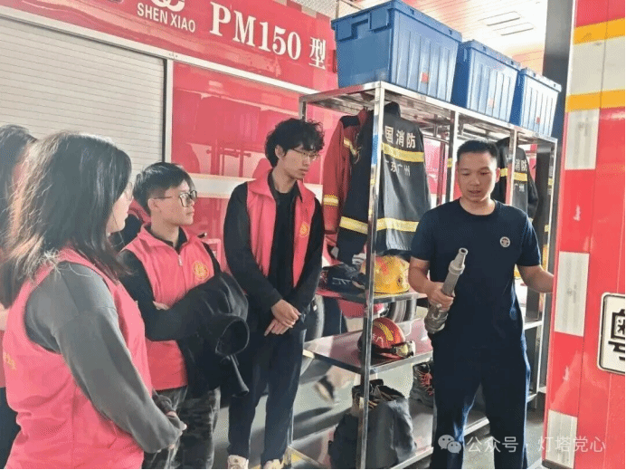 在完成室内学习与交流环节后,党支部成员集体前往从化温泉消防站进行实地参观学习。抵达后,消防站工作人员组织开展现场讲解与观摩活动。消防员系统介绍了各类消防车辆、灭火装备及应急救援器材的主要功能与操作规范,通过专业细致的讲解,使同学们对消防设备的应用场景与操作要领有了更全面的认识。在参观过程中,同志们实地观摩了消防车辆及随车装备,并对部分器材进行了深入了解。消防员结合实战经验,阐释了现代化消防设备在灭火救援中的重要作用,进一步深化了大家对消防安全工作专业性、技术性的认知。