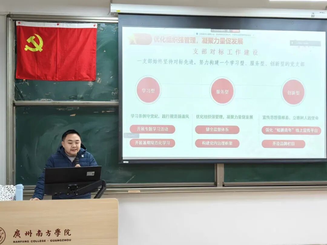 会议第一项议程,由党支部书记陆正祥老师总结党支部年度对标建设工作。陆老师带领全体同志回顾了过去一年的工作实践,强调党支部始终以先进为标杆,着力打造学习型、服务型、创新型党支部。学习层面,围绕党纪条例开展专题学习,常态化推进暑期党纪学习活动;服务层面,组建合作队伍、健全监督体系,构建全面公正的党内治理格局;创新层面,强化线上宣传阵地建设,开设品牌栏目,积极响应国家“三下乡”号召。党支部以党建为引领,依托“同心圆”党建模型,深耕“党建+校友”“党建+就业”“党建+创业”三大板块,深化师生协同合作,切实为学生就业创业赋能增效。同时,陆老师也客观指出党支部存在的不足:一是群众需求响应精准度不足,校内外党支部活动开展的广度与深度有待拓展;二是部分入党积极分子活动参与积极性不高,部分大四党员转正后先锋模范作用发挥有所弱化;三是党支部科研工作成效不明显,需紧跟时代步伐,推动工作往实里走、往深里走。他要求全体党支部成员今后要深入贯彻党的路线方针政策,持续加强学习教育,不断提升自身素养,为国家发展贡献青春力量。