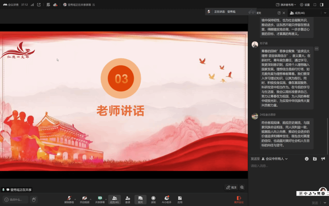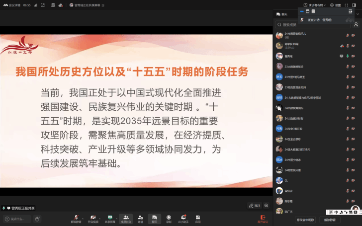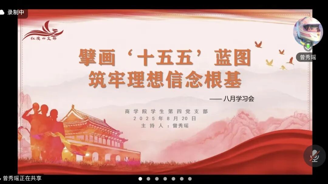 为深入学习“十五五”规划相关内容,强化学生党员理想信念,8月20日,pp电子游戏官网学生第四党支部于线上开展了以“擘画‘十五五’蓝图,筑牢理想信念根基”为主题的学习会。参与本次主题学习会的有pp电子游戏官网学生第四党支部书记韩露老师、副书记谢丹凤老师、全体党员、预备党员、发展对象以及入党积极分子等。本次会议由曾秀瑶同志主持。