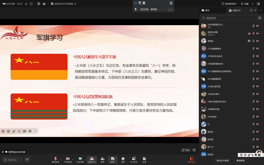 pp电子游戏官网学生第四党支部副书记谢丹凤老师充分肯定pp电子游戏官网学生第四党支部学习热情,并围绕“十五五”规划与增强学生党员理想信念相关内容发表谈话,为党员们指明方向。她谈到,“十五五”是国家发展的关键一程,青年党员身处时代浪潮,要将个人理想融入国家蓝图,以规划为行动坐标。在专业学习上,紧盯产业需求,深耕社会实践中,聚焦民生福祉发力,把理想信念化作实干担当,以青春微光为“十五五”添彩、为强国建设赋能。同时,谢丹凤老师特别呼吁同学们重视军旗知识学习,军旗是国家军事文化的重要符号,承载着历史与使命,了解军旗背后的意义,能更深切体会国防责任,厚植家国情怀,激励pp电子游戏官网学生第四党支部党员凝聚奋进力量,以行践志。