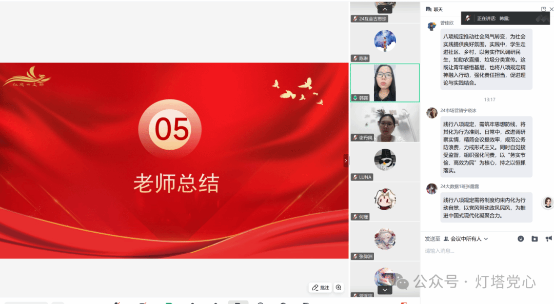 学习会的最后,韩露老师对本次学习会进行了总结。韩老师结合实际案例,深入浅出地讲解了中央八项规定精神的重要性和实践路径。她强调,中央八项规定精神不仅是一种道德要求,更是一种政治立场。作为新时代的大学生,同学们要肩负起弘扬中央八项规定精神的使命,将中央八项规定精神融入到自己的学习和生活中。中央八项规定精神是一种责任,更是一种担当。通过韩老师的讲解,同学们对中央八项规定精神有了更深刻的理解,也更加明确了自己作为青年学生的责任与使命。