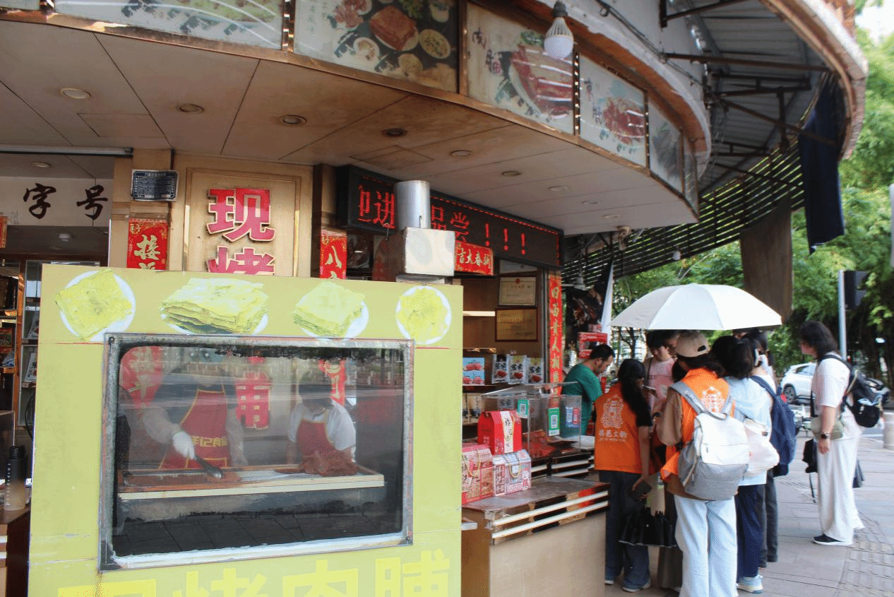 早上,揭邑文韵创保先锋队首先走访了祥记腊味和贤兴甜汤两家本地老字号。在祥记腊味店,队员们驻足观察,只见传统腊味的制作工艺在时光流转中依旧鲜活,从选料、腌制到晾晒,每一个环节都凝聚着匠人的坚守。店主数十年如一日秉持 “品质为先” 的经营理念,让这份老味道在岁月中愈发醇厚。随后,队员们来到贤兴甜汤店,甜香四溢的空气中,店主娓娓道来甜汤配方背后的故事 —— 那不仅是几代人传承的手艺,更是市井生活里的温情印记。队员们认真记录下这些故事,为古城文化的传播积攒着珍贵素材。