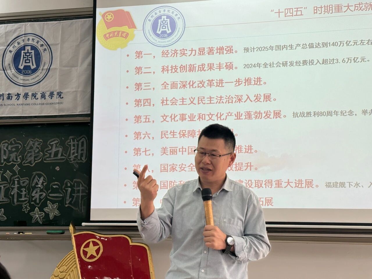 乔华锋老师围绕党的二十届四中全会精神,系统解读了从“十四五”到“十五五”规划的衔接部署及其里程碑意义。他回顾了五年规划的历史脉络,通过“一五”到“十四五”期间的重大成就,如航天救援、福建舰入列等,阐明国家实力提升的历程。针对“十五五”规划,他重点阐释了坚持党的领导、人民至上、高质量发展等六大原则,并结合芯片自主研发等案例,强调科技自立自强的重要性。最后,他寄语青年学子要锤炼专业本领、坚定政治立场、胸怀家国情怀,将个人成长融入国家发展大局,勇担时代使命。