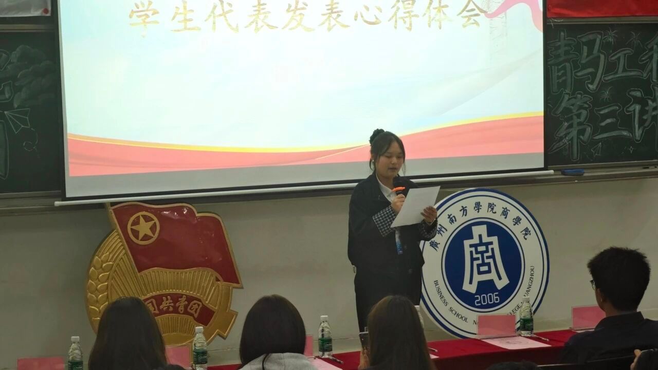观看影片后,来自2025级金融学2班的刘研宏同学作为学生代表分享心得。她表示,影片带来的震撼与启示让她深刻认识到,民族伤痛记忆不容淡忘。作为新时代青年,必须铭记历史、珍视和平,坚定走中国特色社会主义道路的信念。她的分享真挚动人,激发了同学们的共鸣与使命感,激励大家以实干担当时代重任,书写无悔青春。