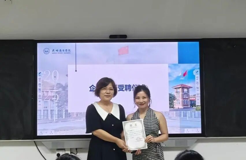 在企业导师受聘仪式上,王秀梅院长为周颖总经理颁发聘书。她表示:“本次合作将《网络营销》课程教学从理论延伸至实战前沿,通过企业导师的实战经验,帮助学生理解AIGC如何重构营销逻辑,这正是我们课程改革的重要方向。”