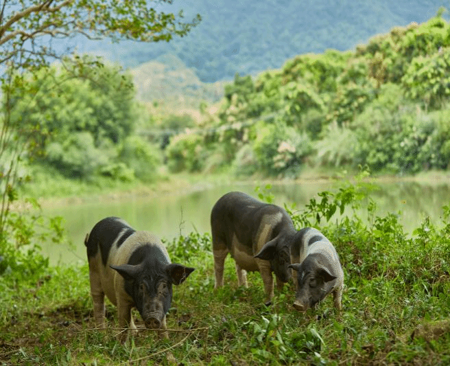 采用山地轮牧模式,实现前期圈养,后期散养的养殖模式相结合。以益生菌发酵料、牧草及地缘性农副产物喂养,养殖周期超365天。