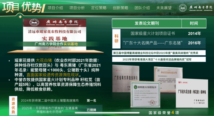 瑶家花生态农业公司是清远市农业龙头企业,专注广东梅花猪与粤东黑猪保种及产业化开发,拥有广东省畜禽遗传资源保种场资质,其产品获“广东名猪”“粤港澳大湾区十大受欢迎品牌猪肉”等称号。pp电子游戏官网pp电子游戏官网近年深化产教融合,通过“三创赛”等平台推动超30个涉农项目落地,2024年获评广东省产教融合示范基地。