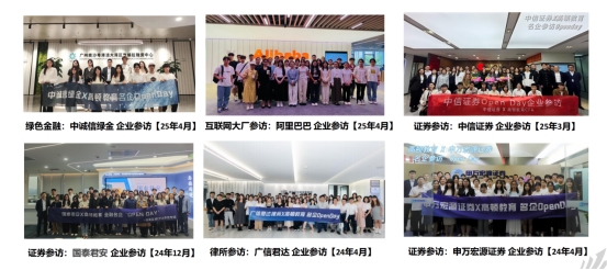 作为个人投资者的财富赋能引擎,证券公司在金融市场中肩负着关键角色。为此,我们特别组织同学们深入走访了国内 500 强券商领军企业,涵盖国泰君安证券、中信证券、广发证券等行业标杆。同时,亦带领大家走进互联网浪潮下的头部企业阿里巴巴开展探索之旅。