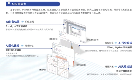 基于Excel、Python等传统金融工具,深度融合人工智能技术与金融业务场景,聚焦估值建模等核心领域,培养学员从数据挖掘、分析洞察到实现决策优化的全链路能力,打造金融专业素养与科技应用能力兼备的复合型人才。