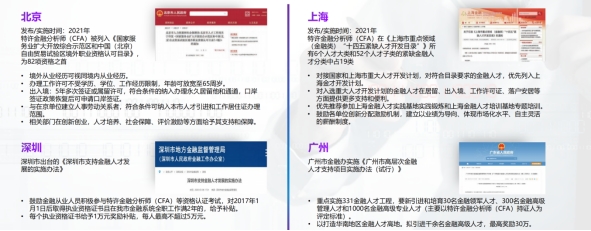 北京、上海、广州、深圳、西安、苏州、宁波、武汉、成都、杭州、南京、天津、厦门等全国20余个省市的地方政府均出台了针对CFA持证人的人才引进政策。以广州市为例,其地方金融监督管理局实施的《广州市高层次金融人才支持项目实施办法》规定,面向高层次金融人才提供最高30万元的奖励。
