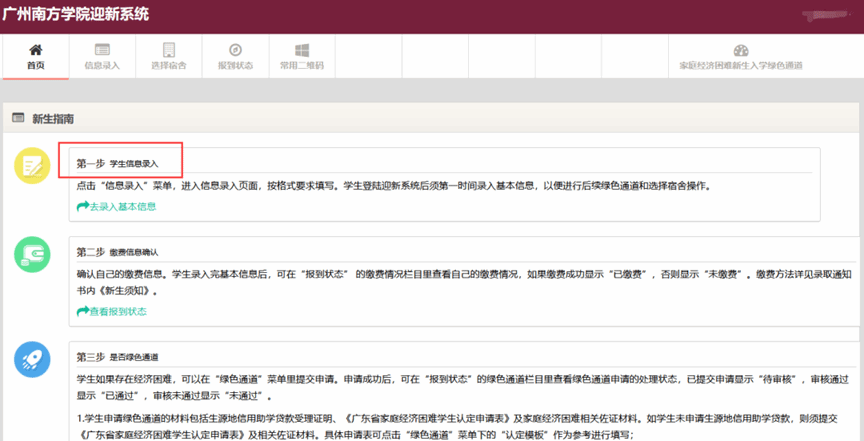 登录迎新系统,点击信息录入,填写并核对本人基本信息。