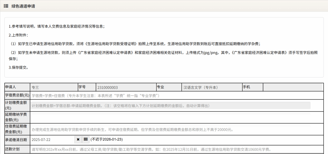第四步:填写延期缴纳学宿费信息,详细要求请参考表格中的填写说明。