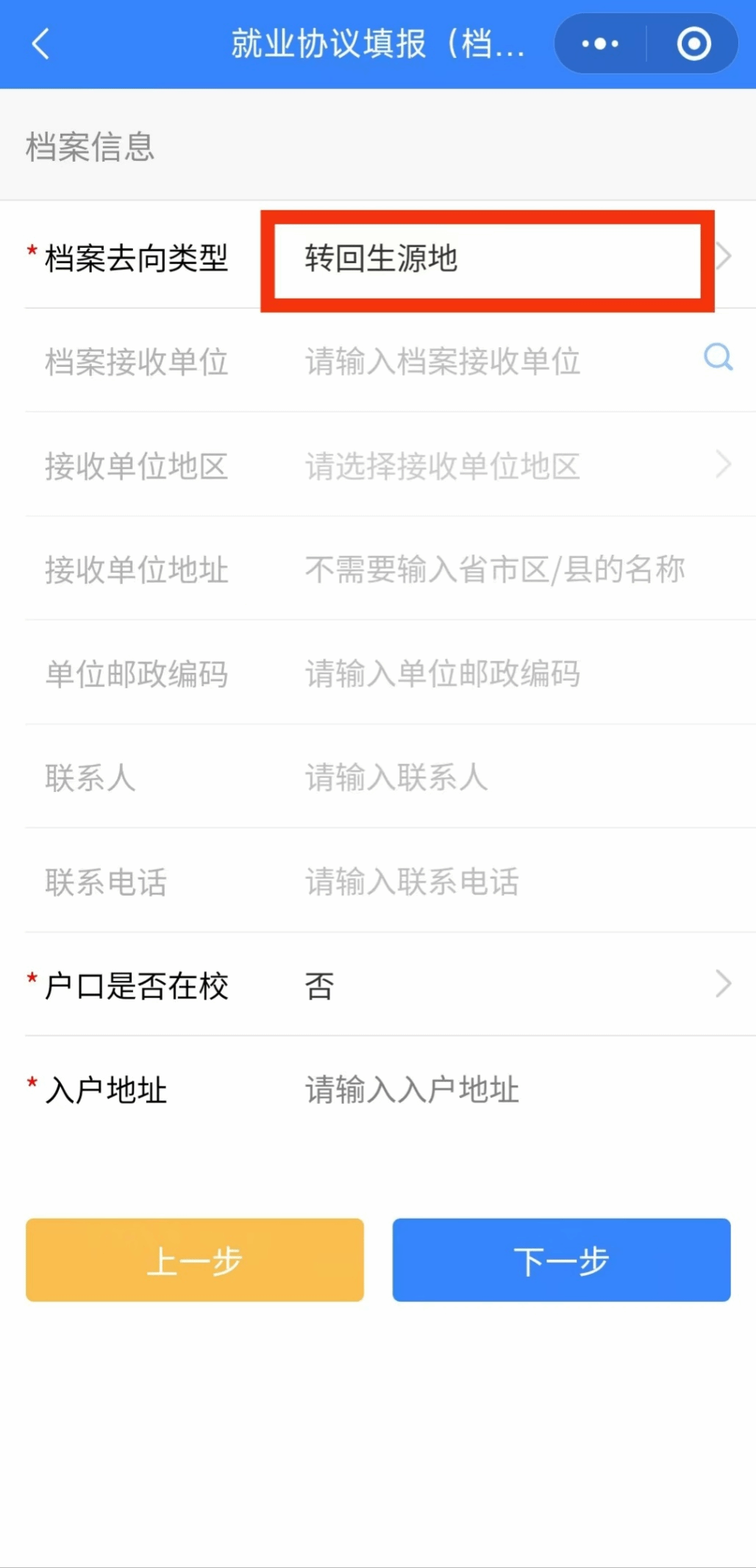 档案去向类型共分四类:转回生源地、签约单位接收、托管单位接收、上级主管部门接收。建议在签约前和单位沟通清楚档案、户口去向及主管单位、报到地址、具体派遣单位等信息。档案去向一般选择“回生源地”,若档案去向为非“回生源地”,务必核实单位是否有接收档案权限;务必核实单位是否愿意接收档案,两个条件同时满足方可。
