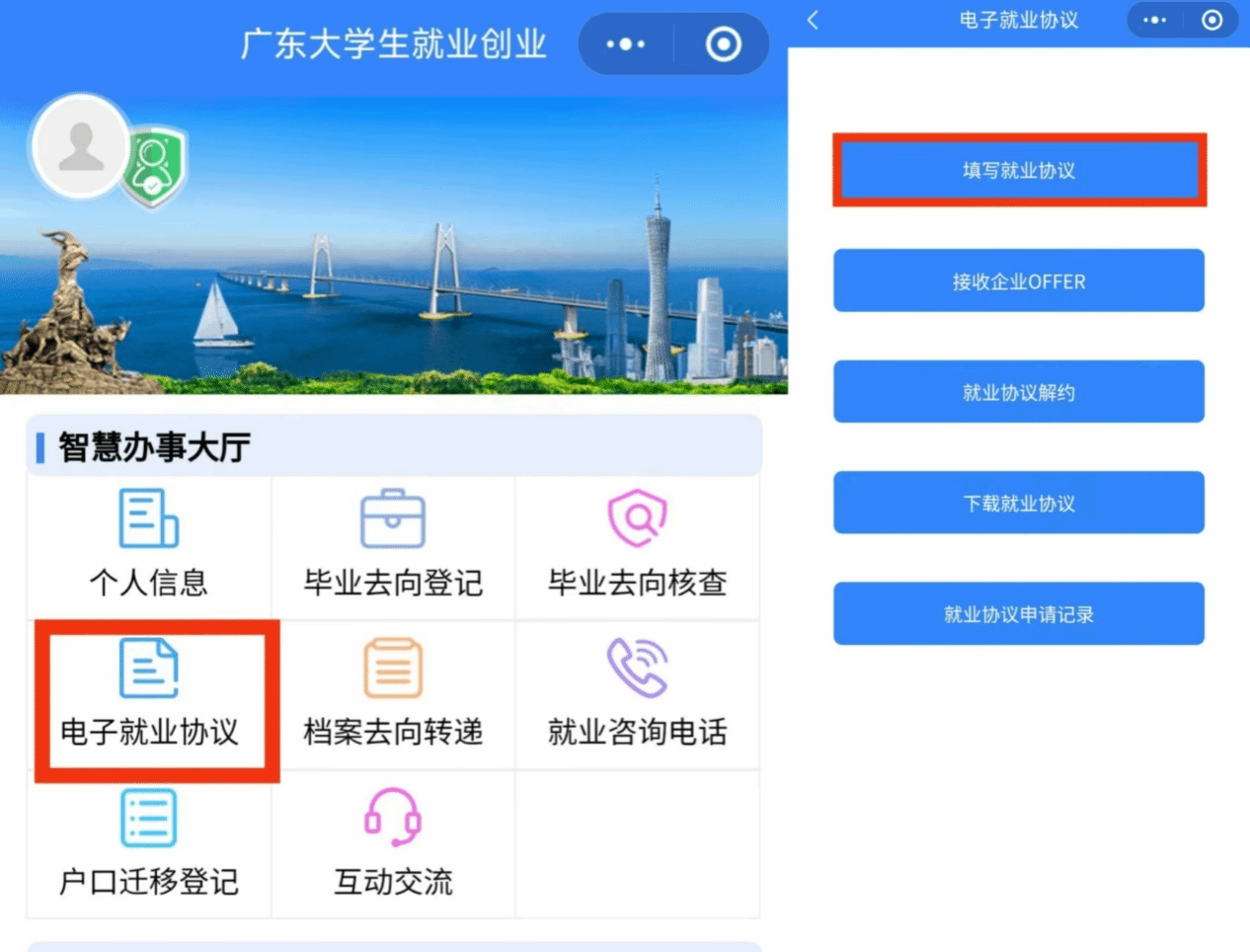 打开微信小程序“广东大学生就业创业”,点击图中“电子就业协议”。如提示“学籍绑定”,则先完成学籍绑定。绑定学籍后可进入“电子就业协议”,点击“填写就业协议”。